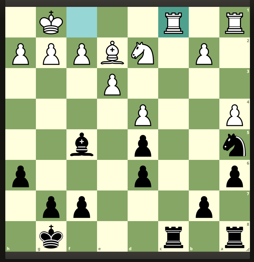 My opponent played Rfc1, contesting control of the open file. Naturally, a huge positional achievment would be doubling rooks on the c-file or landing a rook of my own on c2 to control the second rank. He was attempting a mirror-image plan, and I had to wrangle with both a potentially weak d5 pawn and a limited knight on a5. I calculated Bc2, Rc2, Be6, even b6 as my next move — but nothing seemed to shift the balance. He’d all but shut down my plans of doubling rooks and the game is objectively drawn according to the engine.