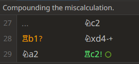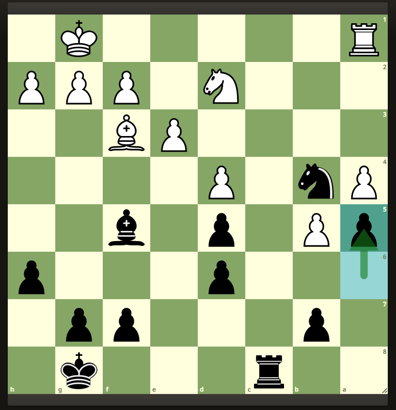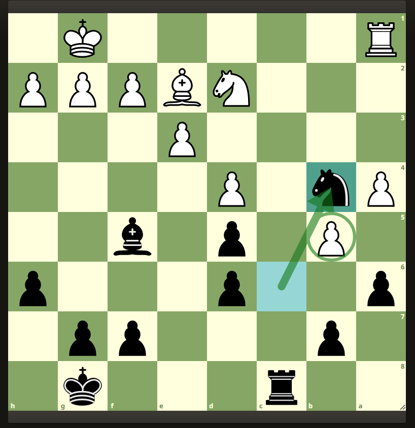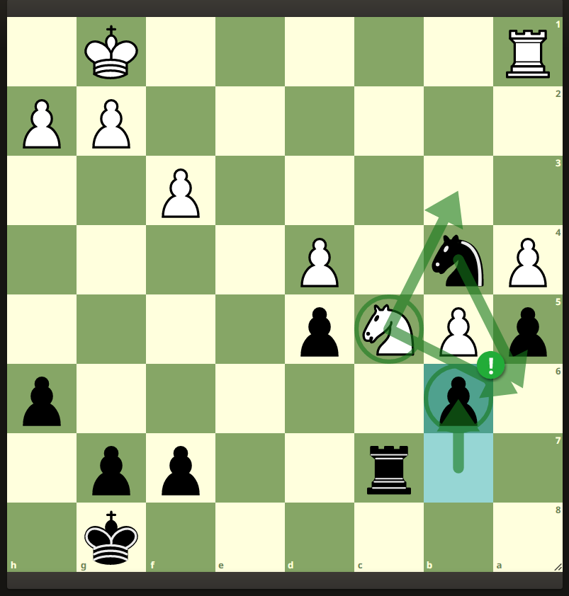 After b6, I had actually underestimated Na6 — the moving looking so unnatural as it immediately drops a pawn. But I did spend a non-trivial amount of time on Na5, given it would leave my rook passive on a6 (should I elect to chase down the extra pawn. Rejecting Na5 perhaps a moment too quickly, my opponent made the game’s only mistake: