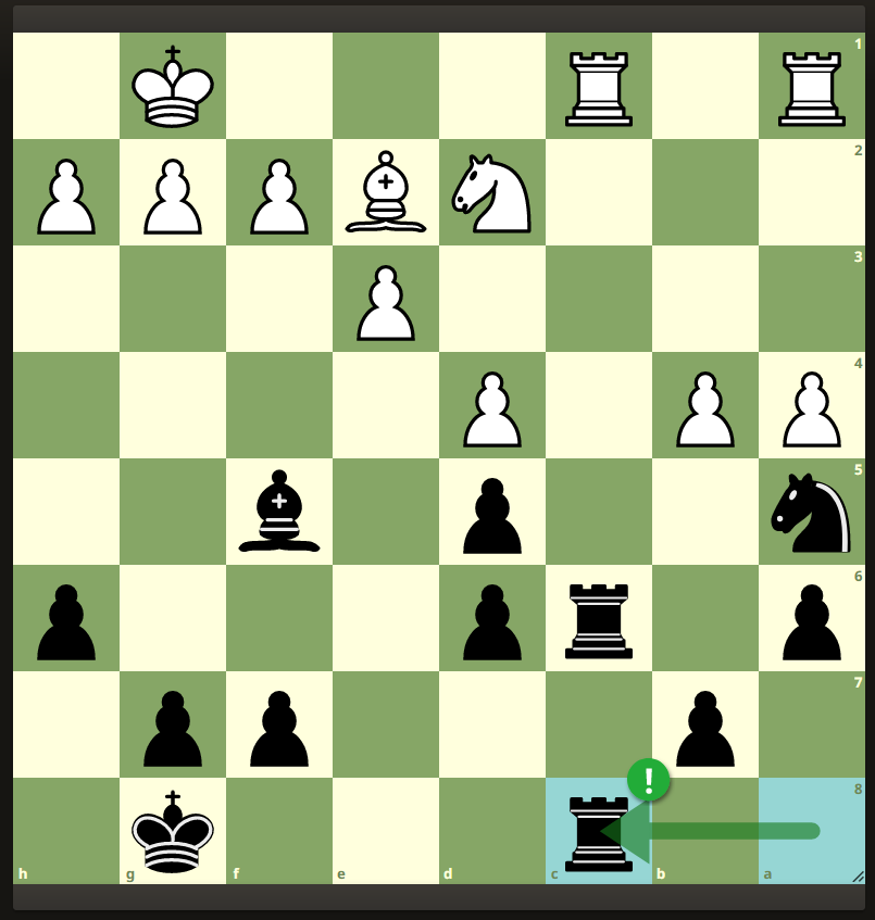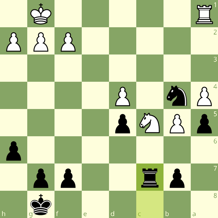Rac8! Can’t he just take the knight? No — the rooks now team up to double-attack the rook on c1. Should he take the knight, I take twice on c1 and win a rook for a knight (with check). In a position like this, that’s a decisive advantage and an easy endgame conversion.