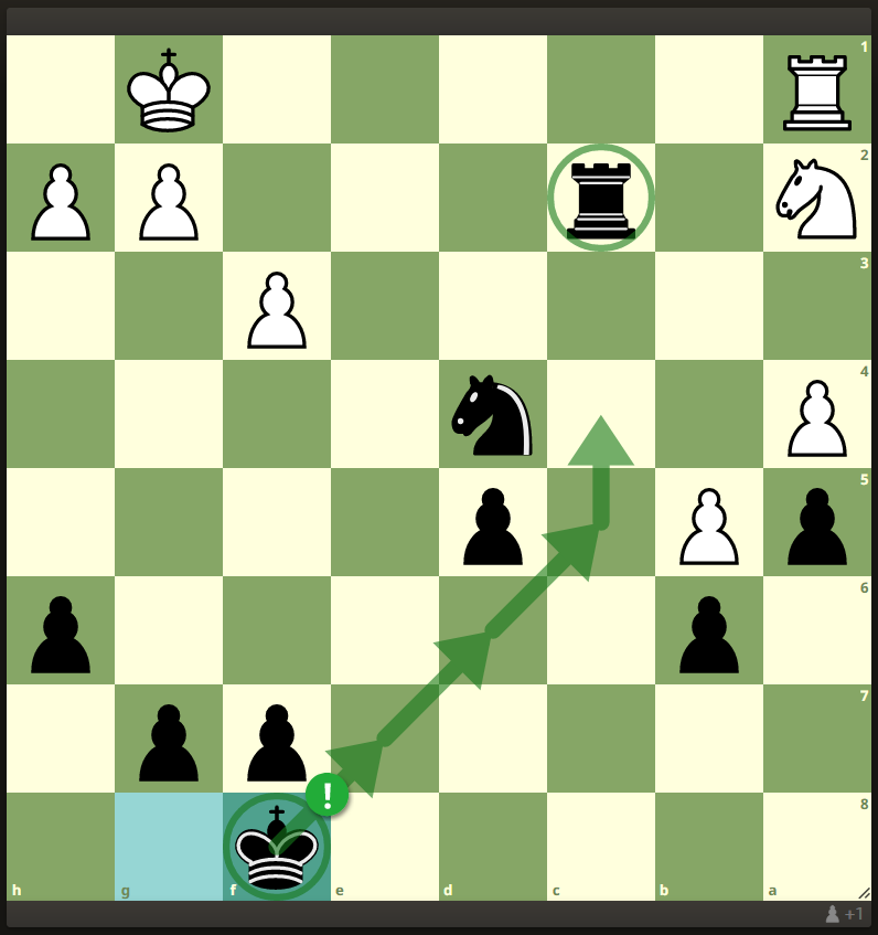 After the simple Kf8, my opponent resigned. He simply can’t move a single piece; the inevitable king march to c4 highlights the severity of paralysis: